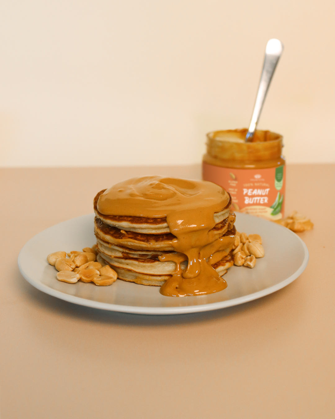 • Servez les pancakes avec la garniture au beurre de cacahuète et décorez avec vos fruits préférés et quelques fruits secs.
